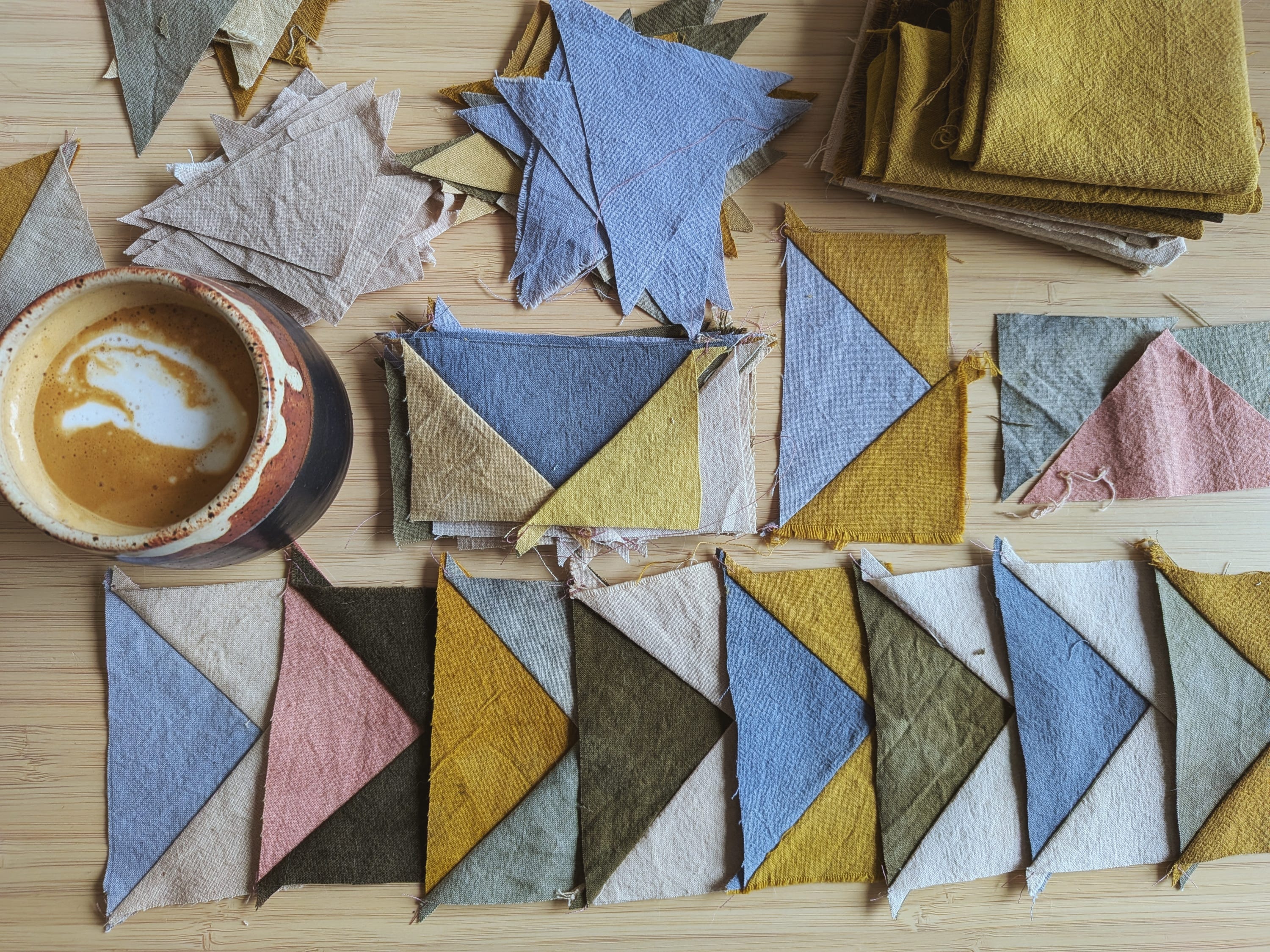 A small batch of natural dyes (blueberries, onion skins and old man’s beard) to be made into the flying geese border for the quilt.